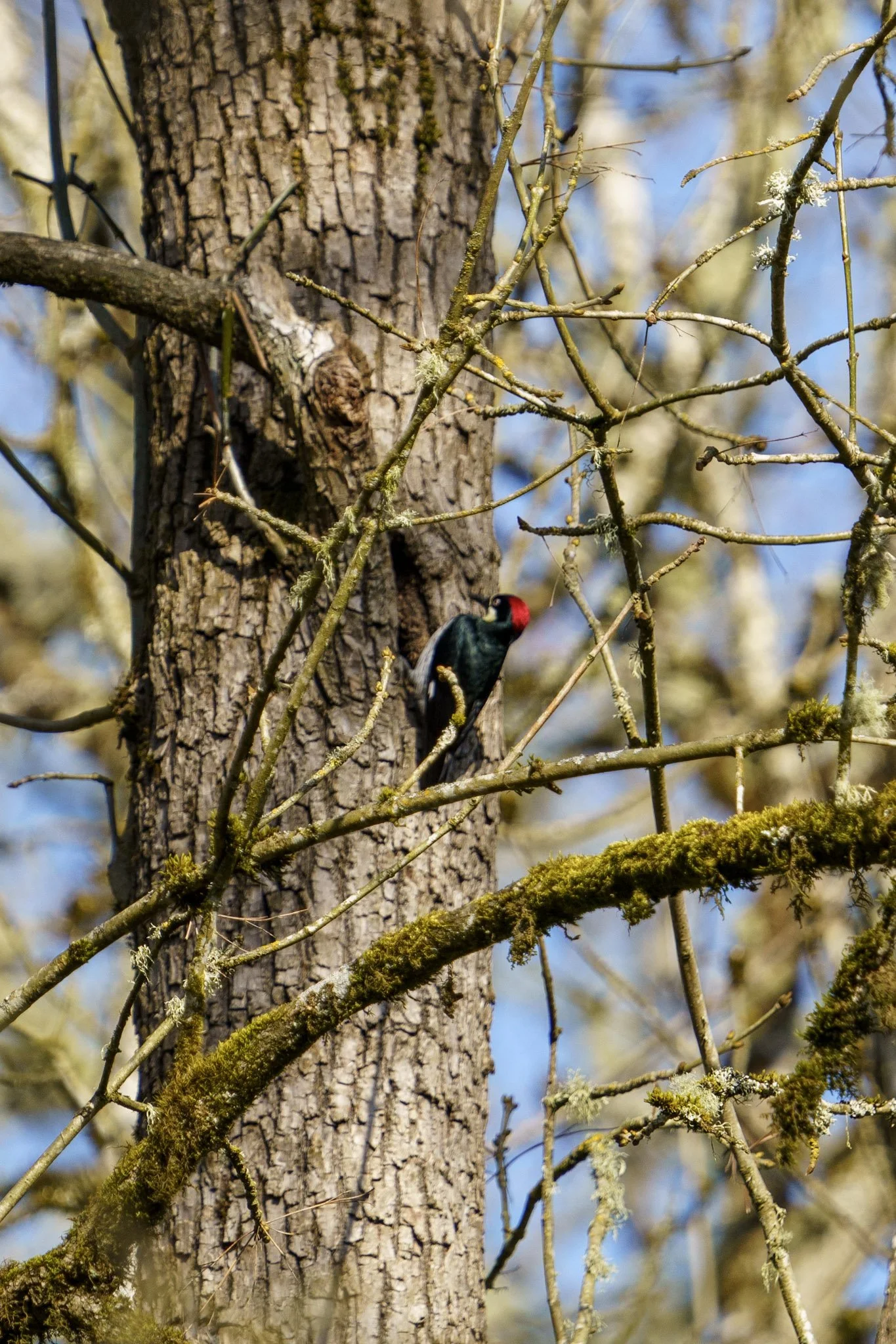 The red heads of acorn woodpeckers brighten up a winter day