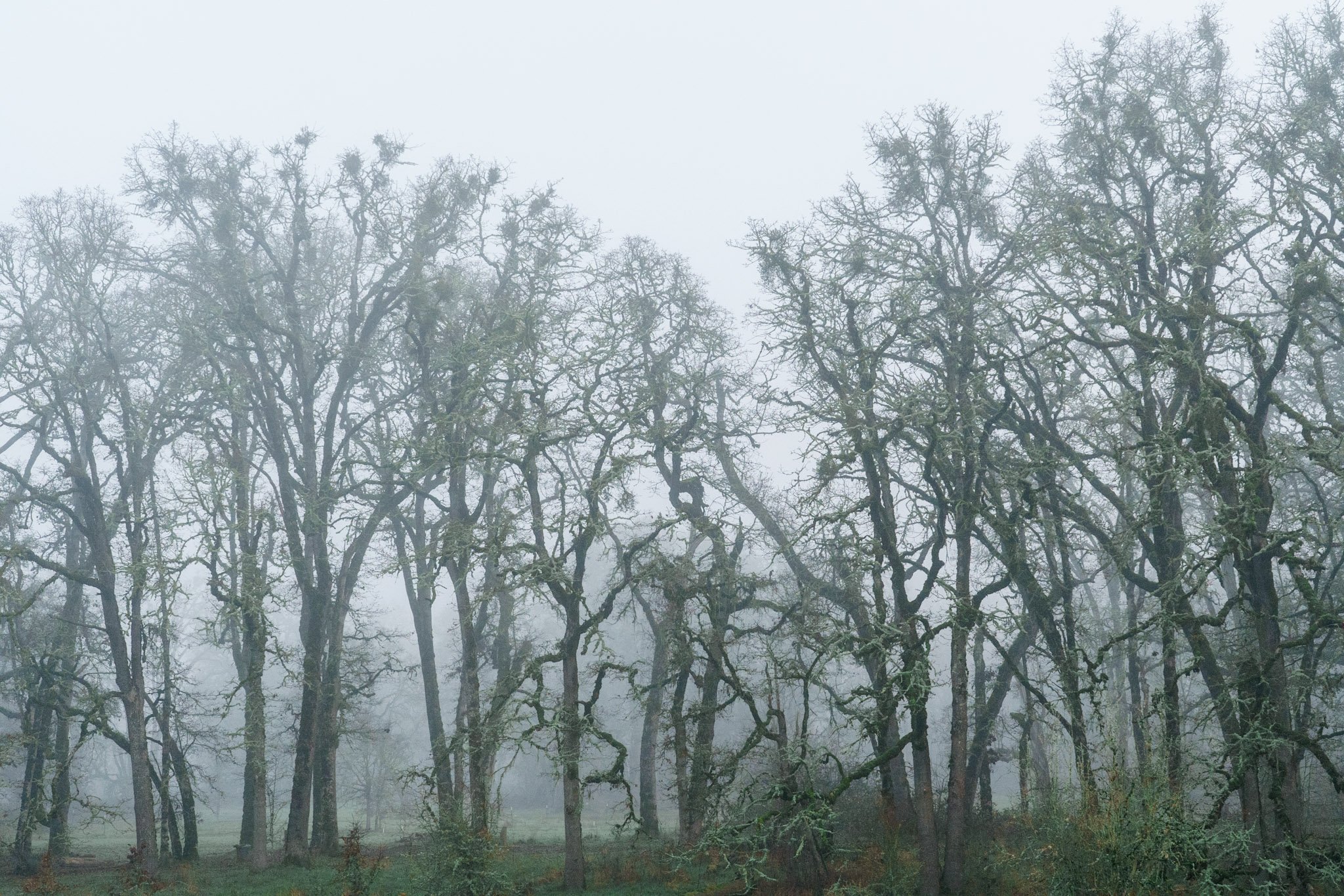 Twisted oak trees really stand out on a moody, foggy December day