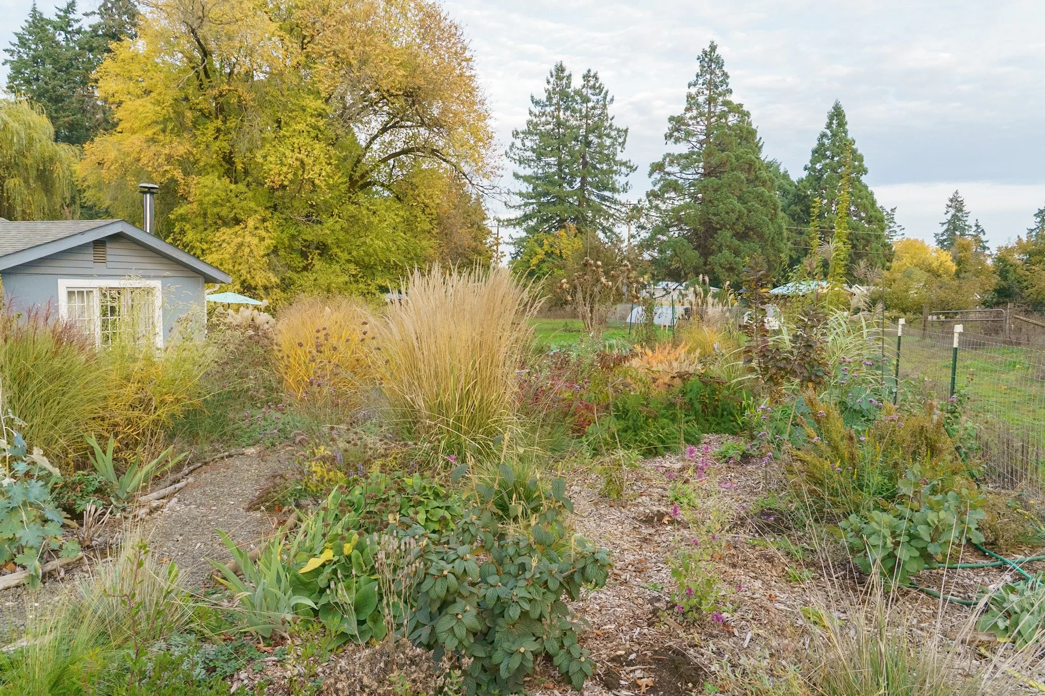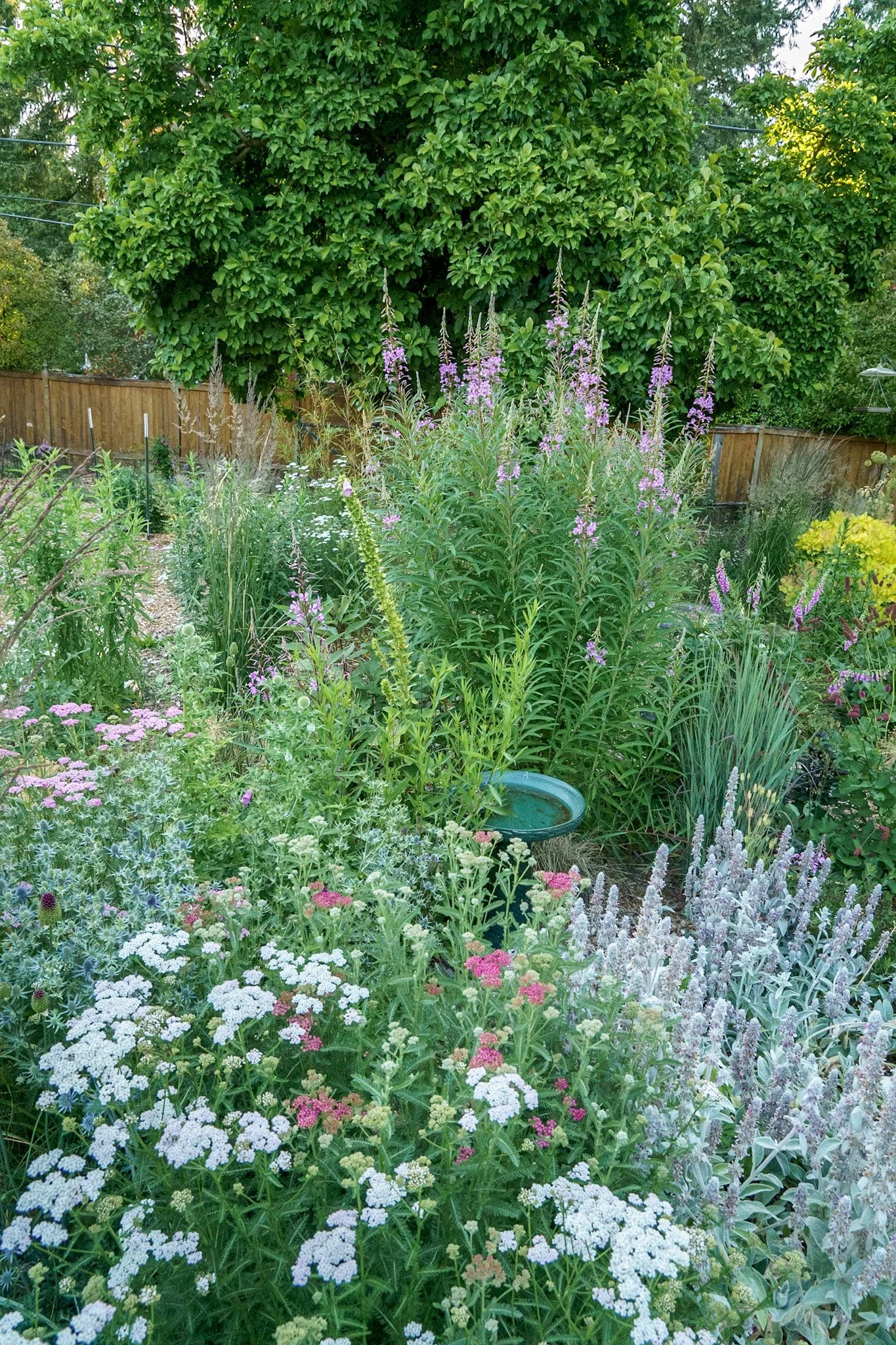 Before I moved to my new garden in 2023, I was gardening on half an acre in the suburbs. Here’s what a section of my garden looked like 2 years after planting: lush, overlapping plants, full of flowers.