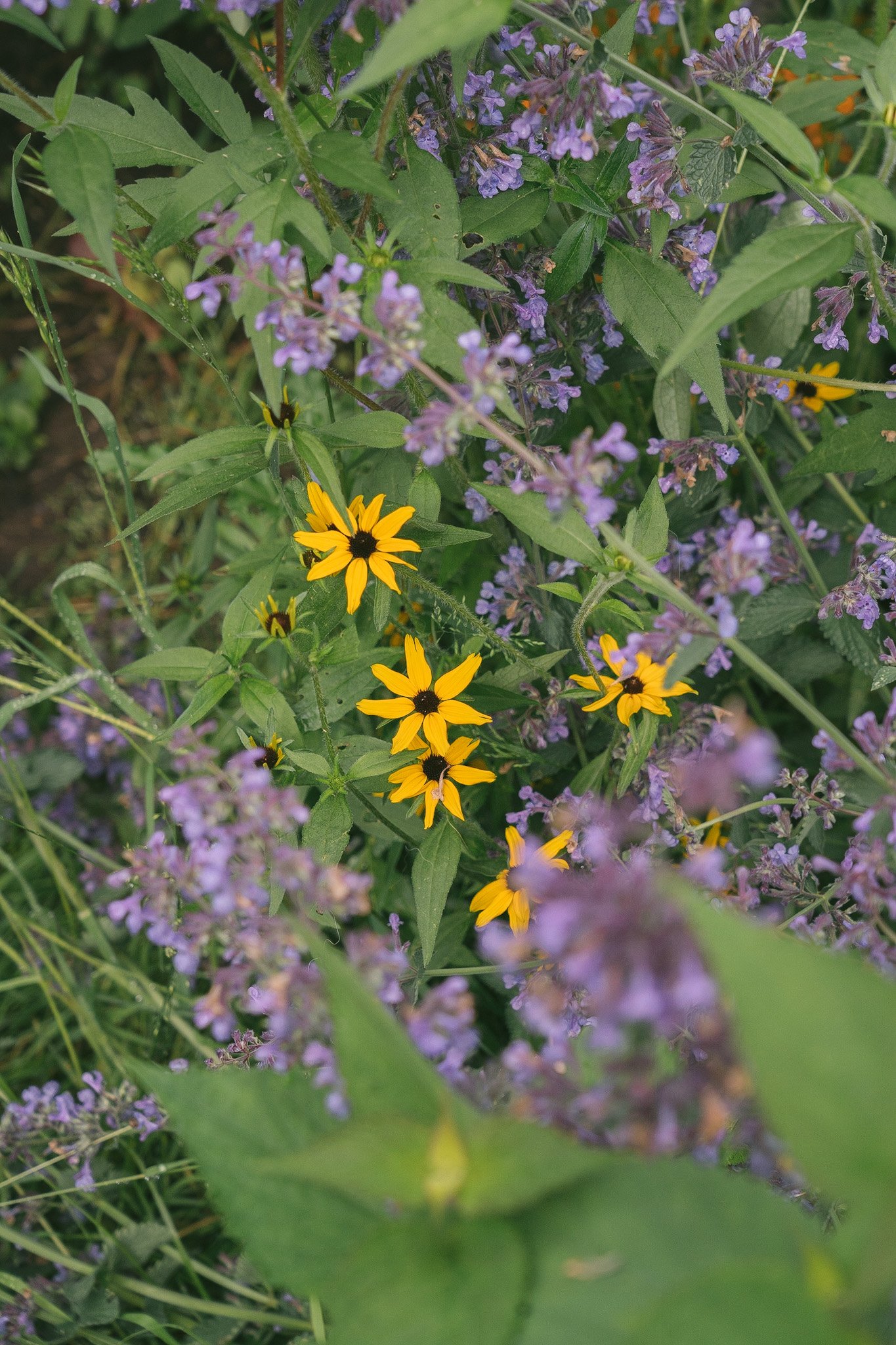 Cute little rudbeckia grow up among grasses and blue nepeta