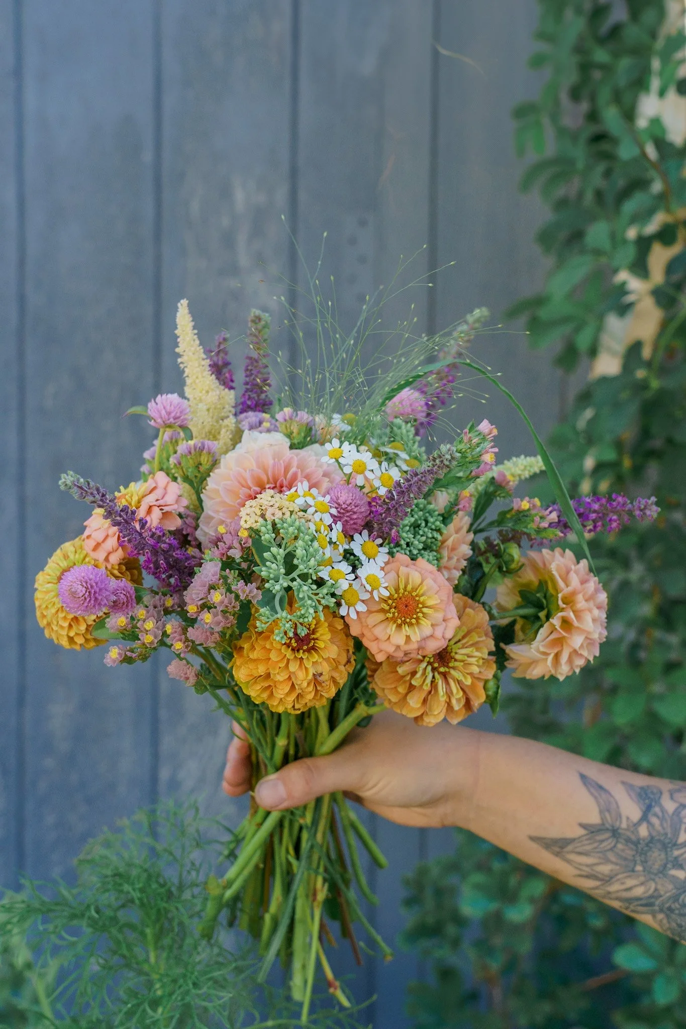Included in this summer bouquet are zinnias, feverfew, statice, gomphrena, and grasses, all easy to grow at home!