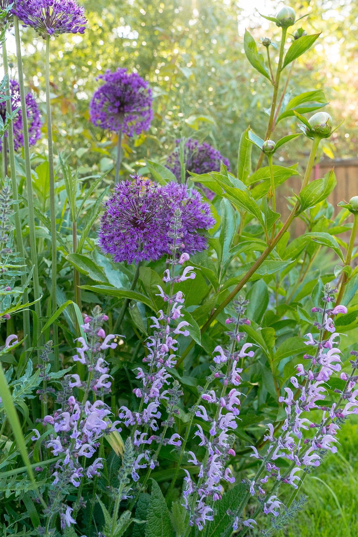 3 plants together give a long season of interest: spikes a lavender-hued salvia, purple globe allium, and then peony buds behind that