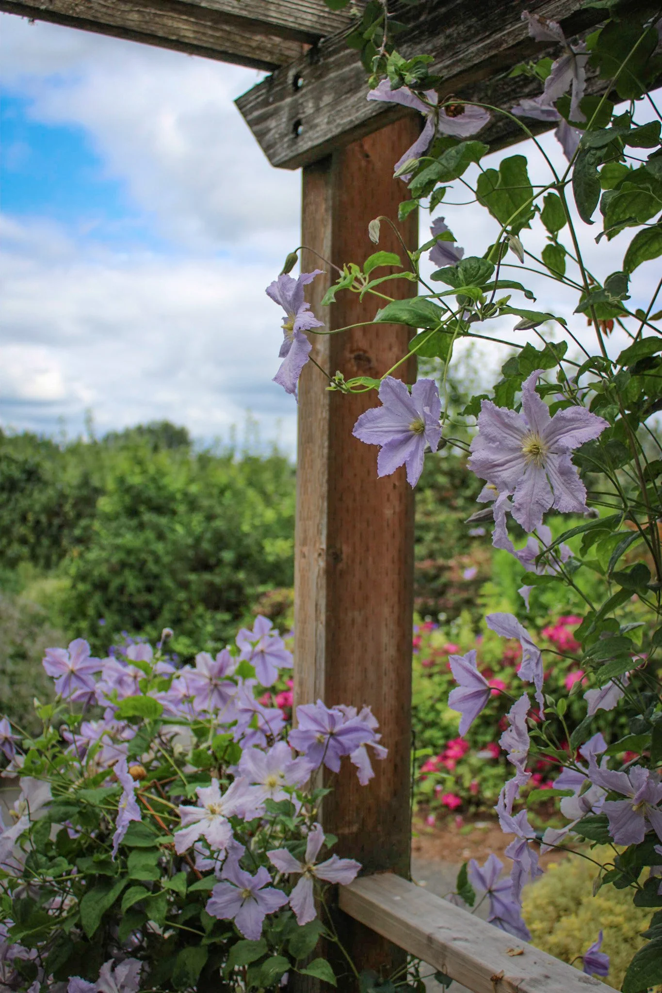 Clematis rambling over an arbor at the Rogerson Clematis Garden. These easy-to-grow vines give your garden instant cottagecore vibes