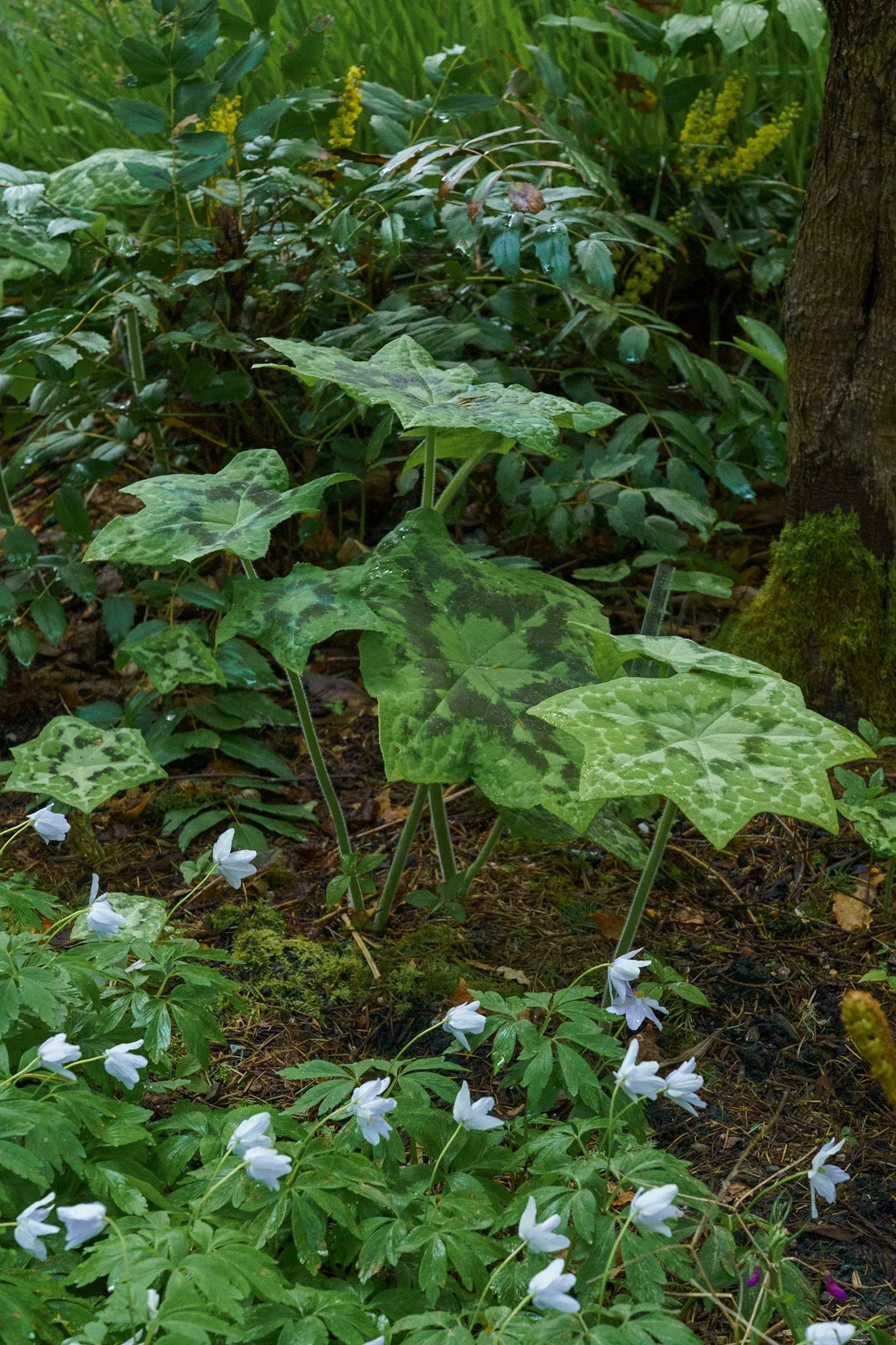 I believe the large leaves are a type of ‘Podophyllum’ and the small white flowers are a kind of wood anemone