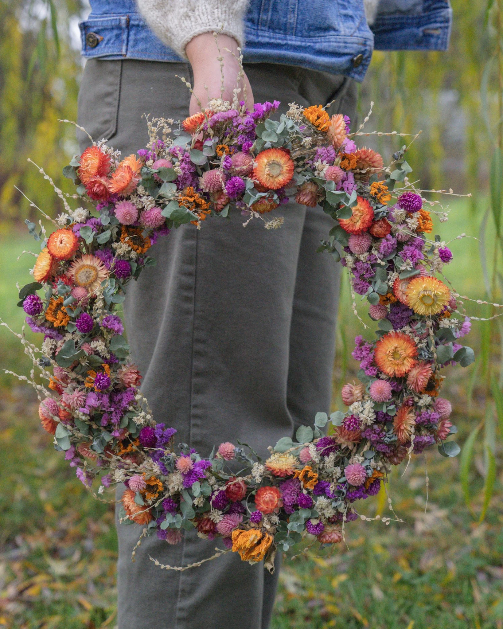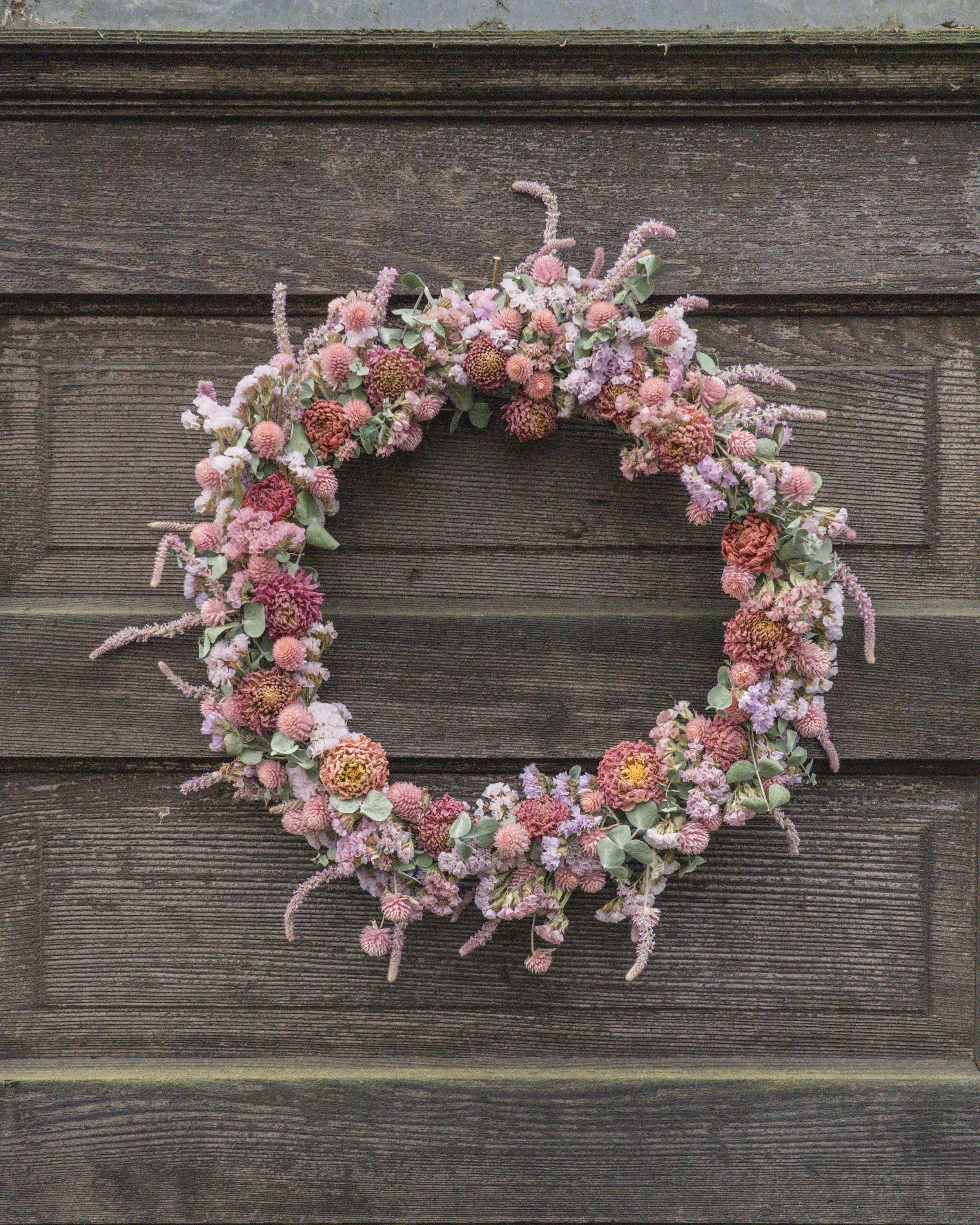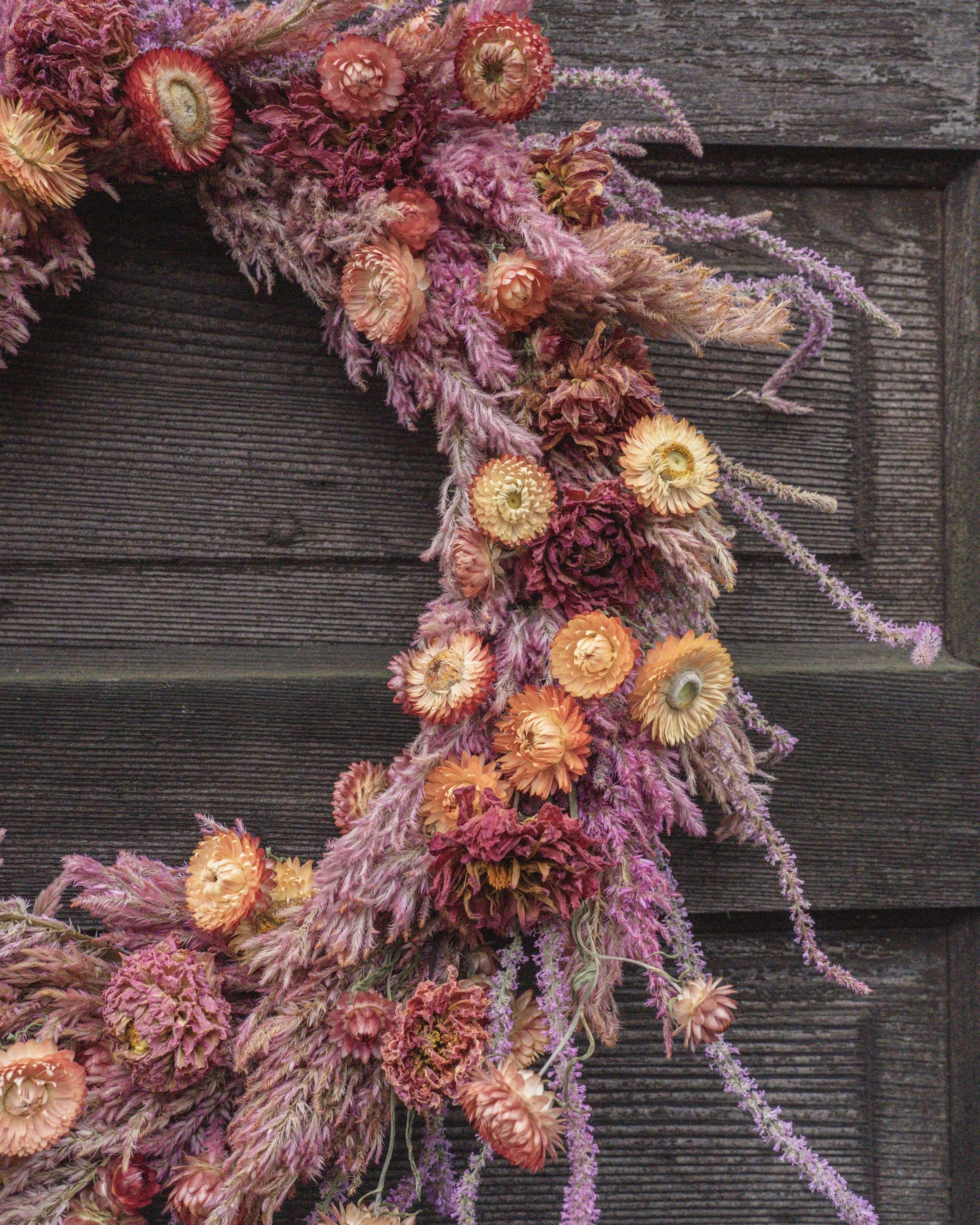 I’ve been making these for a month and now I finally get to show them off to you! All these flowers started from seeds I planted months ago, carefully hung to dry all summer, and then spent hours crafting into wreaths.