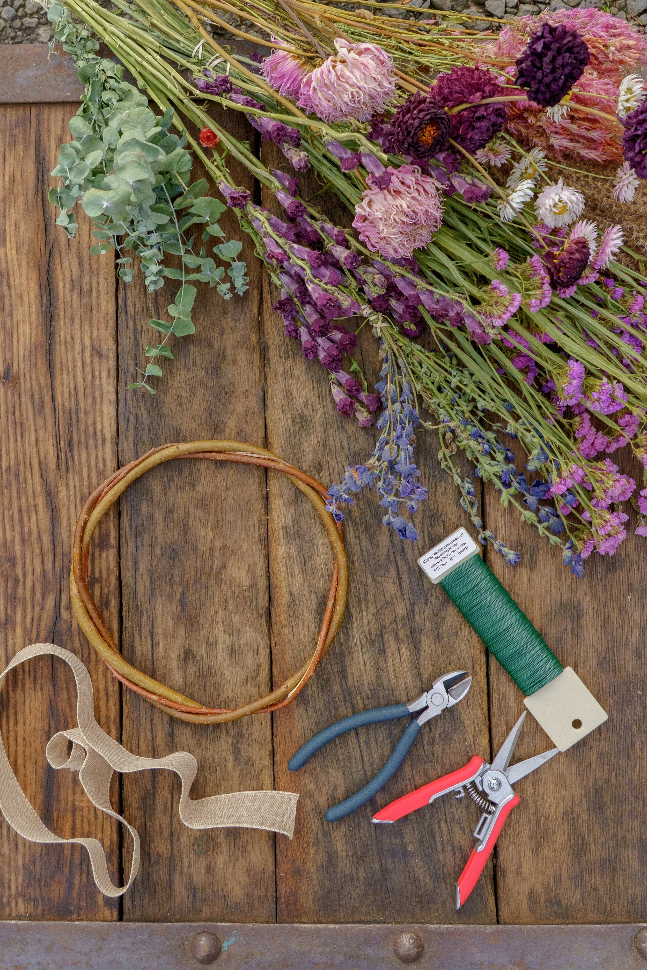 Supplies needed to make a wreath: snips, wire, flowers, and a willow wreath base