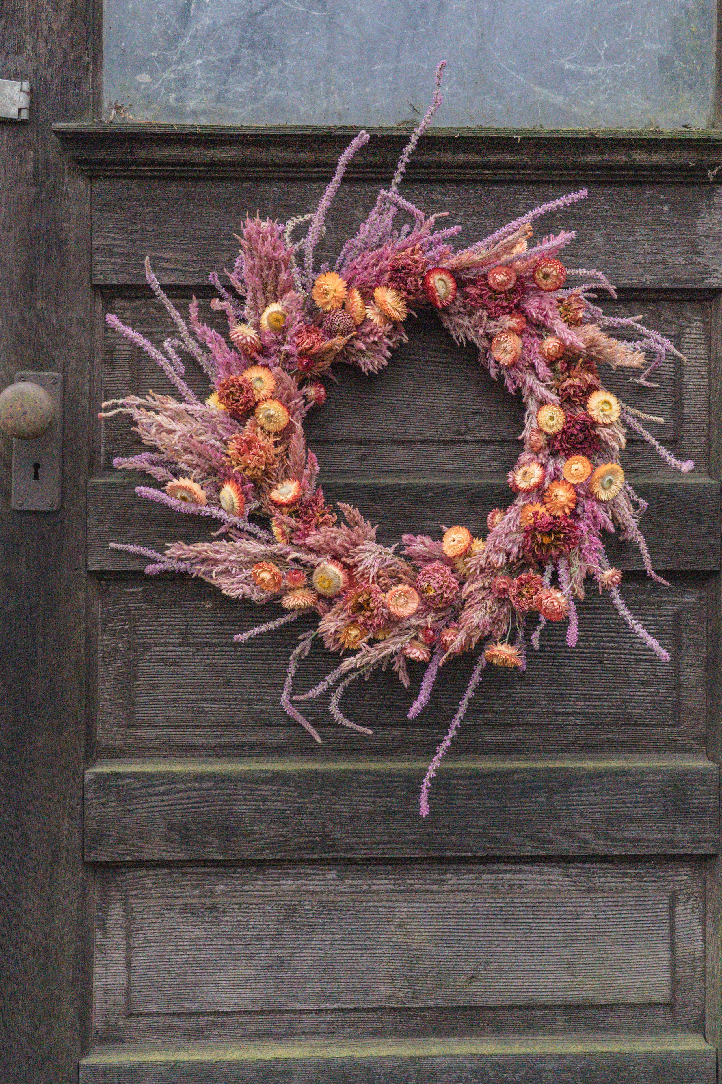 I love the wild pink pokers on the outside of this wreath