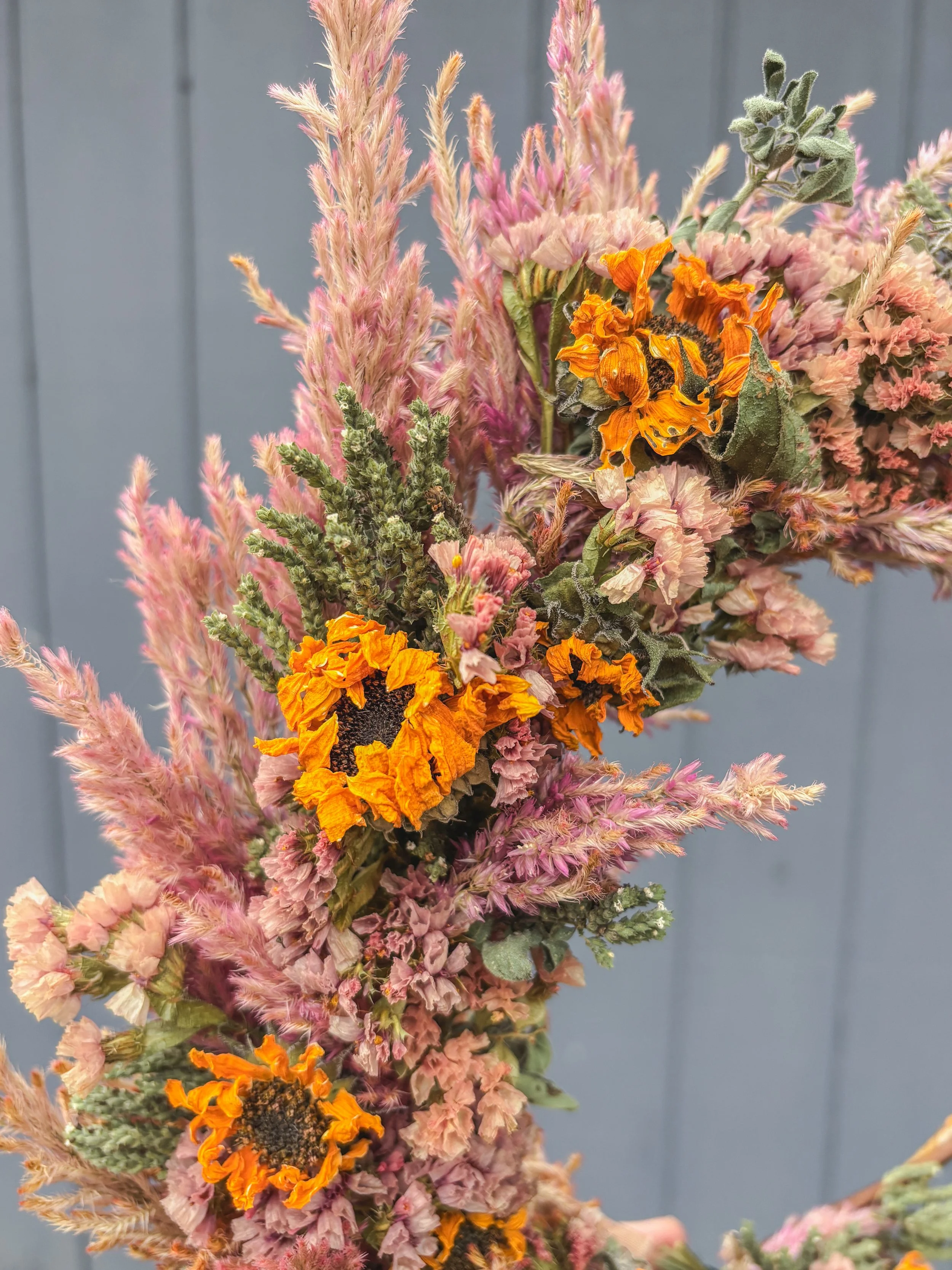 Sunflowers, gomphrena, and strawflowers make up this colorful wreath
